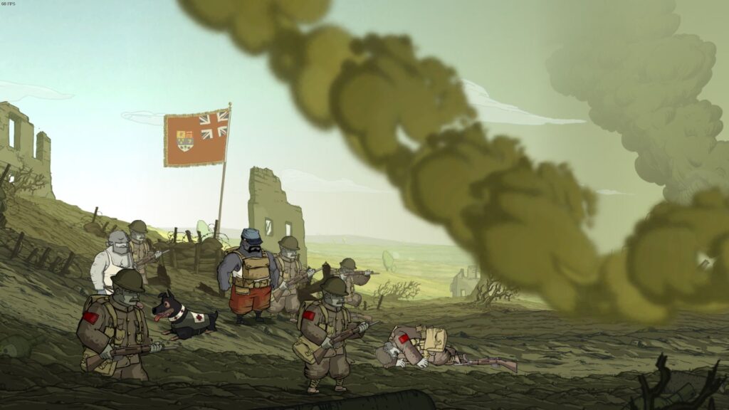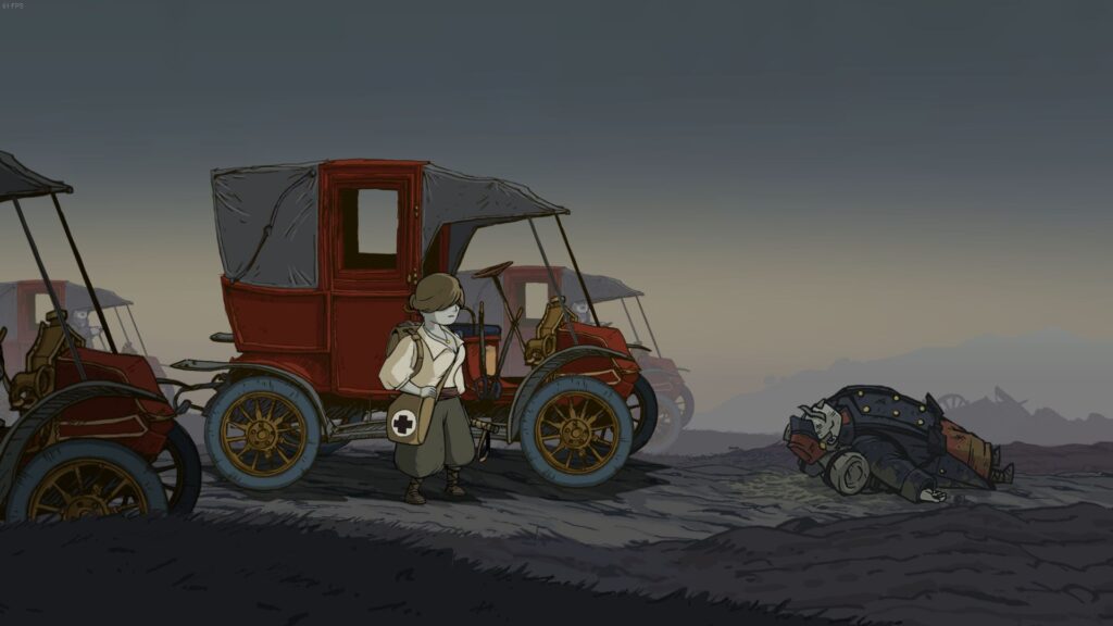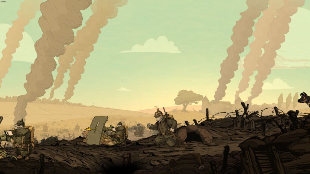 Gatunkowo można by przypisać Valiant Hearts: The Great War do przygodówek 2D, lecz takie podsumowanie wydaje się dość mało dokładne. Każda z prowadzonych postaci charakteryzuje się inną umiejętnością, a co za tym idzie – mechaniką rozgrywki. Emile dysponuje na początku… wielką chochlą (to nie żart. Dopiero potem zamienia ją na inne narzędzie), którą może przydzwonić zagradzającemu mu drogę oponentowi oraz kopać tunele. Freddie ma na wyposażeniu nożyce do cięcia drutu kolczastego, neutralizujące ową przeszkodę. Karl… Cóż. Karl głównie się ukrywa i przemyka w cieniu, wystrzegając się wykrycia przez nieprzyjacielskie patrole, ale więcej na ten temat nie piszę (spoilery). Anna natomiast, z racji pełnionego zawodu, ratuje życie rannym. Odbywa się to na zasadzie minigierki z wykorzystaniem QTE, podczas której należy wcisnąć przyporządkowany przycisk w odpowiednim momencie. Nad tym tytułem nie pracował David Cage, toteż mogę zdradzić, że niezaliczenie owych sekwencji nie ma żadnych negatywnych implikacji; trzeba próbować do skutku. W ogóle, przy okazji warto chyba nadmienić, że gra jest do bólu liniowa: brak tu wyborów rozgałęziających scenariusz, a zakończenie jest jedno. Czy to wada? Nie sądzę. Dzięki temu, że zostało ono zunifikowane, końcowe sceny należycie wybrzmiewają. Odnośnie do wspomnianego wcześniej psa, to nim sterować się nie da, za to można wydawać mu różne polecenia, np. by przestawił dźwignię czy przyniósł w pysku jakąś rzecz. Spora część gameplayu polega bowiem na rozwiązywaniu zagadek (zwykle łatwych, czasem trudniejszych), lecz nie tylko, bo znalazło się tu też miejsce na elementy czysto zręcznościowe (unikanie ostrzału, bomb czy min, ale i kraks w trakcie prowadzenia samochodu. Są też walki z bossami) czy skradankowe. Wysoki, a niekiedy rewelacyjny poziom prezentuje soundtrack, w który – oprócz utworów skomponowanych do gry – wpleciono też takie znacznie od niej starsze. Usłyszymy tu The Star-Spangled Banner (czyli hymn USA), Węgierski taniec numer 5 ze zbioru 21 melodii Johannesa Brahmsa, jak również Infernal Galop: słynny fragment operetki Jacques’a Offenbacha pod tytułem Orfeusz w piekle. Słyszał go chyba każdy, a kto mi nie wierzy, niech sobie sprawdzi na YouTube. Grafikę określę jako kreskówkową, bo pod względem oprawy gra przypomina animowany komiks. Nietypowy o tyle, że w dymkach dialogowych nie pojawia się tekst, a obrazki wyrażające emocje, oczekiwania tudzież przedstawiające twarze konkretnych osób. Zadaniem gracza jest natomiast domyślić się, co dokładnie chce przekazać dany rozmówca (udźwiękowienie dialogów jest szczątkowe i sprowadza się do wypowiadania pojedynczych słów). Muszę powiedzieć, że takie rozwiązanie sprawdza się świetnie, budując specyficzny klimat. Przerysowany, karykaturalny wygląd postaci sprzyja zaś potencjalnemu wpadnięciu w pewną pułapkę: przez taki ich design łatwo ulec pozorom i uznać Valiant Hearts za czczą opowiastkę, ze spuszczającymi manto rozmaitym łajdakom i zbójom superherosami w rolach głównych. Nic bardziej mylnego.