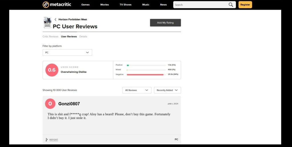 Coś z tą brodą muszę zrobić. Muszę jakoś wyrazić swoje zdanie. Spadam więc na tę skarbnicę wiedzy o grach. Świątynię mądrości, ostoję obiektywizmu i Mekkę Prawdziwych Graczy, gdzie mogą się oni dowiedzieć, czy dana produkcja jest wartościowa czy też nie. Spadam na ten wspaniały, wiarygodny i opiniotwórczy serwis. Genialny w swych założeniach do tego stopnia, że nie trzeba nawet gry kupić, by móc ją na nim ocenić. Już za chwilę, w merytoryczny, konstruktywny sposób zohydzę HFW innym, zanim jakaś małolata napatrzy się na Aloy i zapragnie, by jej kłaki z policzków sterczały. Bo przecież każda dewiacja jest zaraźliwa i można ją złapać od samego na nią patrzenia. Podsumuję ten szajs w najlepszy możliwy sposób, za pomocą jednej cyferki. I już zaczynam czuć się lepiej.