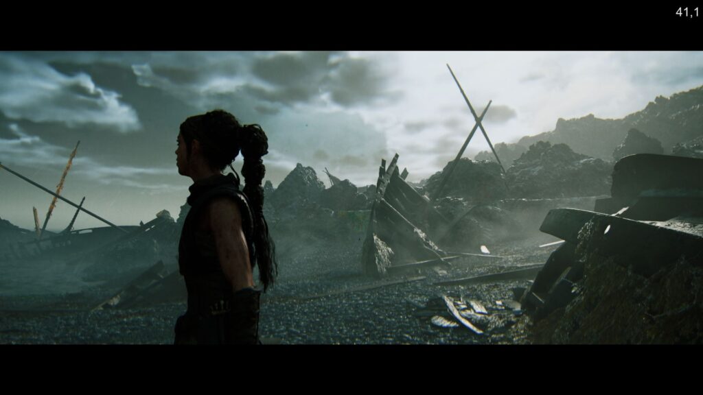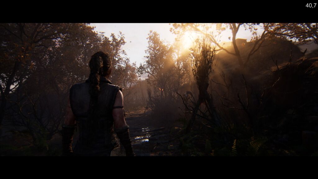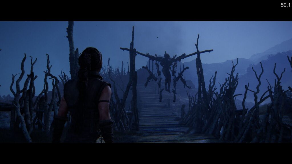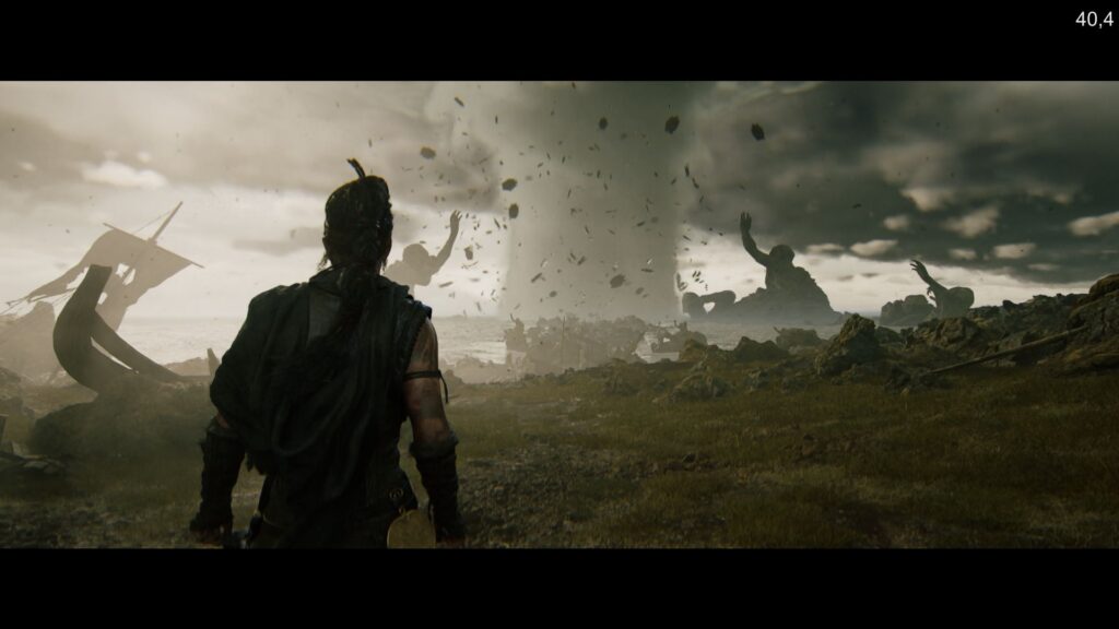 Grafika prezentuje się wspaniale i trudno jest mi znaleźć dla niej godnego rywala w postaci innego tytułu, który widziałbym na własne oczy i który wzbudziłby we mnie porównywalny podziw. Jednak wyrażając całkowicie zasłużone zachwyty nad nią, powinno się to robić z uwzględnieniem kilku uwag. Po pierwsze, Hellblade II – w sensie przestrzeni i powierzchni świata przedstawionego – jest produkcją małą i ciasną. To starannie zaprojektowana liniowa korytarzówka, w której gracz prowadzony jest od punktu A do B, a dostępne lokacje (jest ich ledwie kilka) nie pozwalają mu na swobodną eksplorację. Po drugie, z powodu zastosowania nietypowych proporcji obrazu u dołu i na górze ekranu obecne się nieustannie czarne paski. Potęguje to wspomniane wcześniej kinowe doznanie, wrażenie obcowania z interaktywnym filmem, ale też – jak mi się zdaje – stanowi sprytny zabieg twórców, ułatwiający im pracę nad optymalizacją (bo część grafiki nie jest wyświetlana, o ile gracz nie spojrzy prowadzoną postacią pod lub nad siebie). I po trzecie: szata graficzna wykazuje trochę nierówny poziom, w grze dominują zaś (co znamienne) miejscówki spowite mrokiem czy też zamglone, gdzie – mówiąc wprost – niewiele widać. By oddać jej sprawiedliwość, dodam, że owszem, znalazły się tu również takie oświetlone, lecz podróżowanie po tych terenach za dnia prowadzi do refleksji, iż światek w Hellblade II raz, że niewielki, to jeszcze świeci pustkami. Grałem na karcie RTX 3060, a więc nie na jakimś mocarzu, za to niezmiennie najpopularniejszym GPU wśród użytkowników Steama (źródło: najnowsza ankieta sprzętowa tej platformy). Na wysokich ustawieniach graficznych z włączonym DLSS-em nie było mowy o stałych sześćdziesięciu klatkach. Ich licznik kręcił się najczęściej w okolicy czterdziestu paru. Oczywiście, niech każdy szuka konfiguracji optymalnej dla siebie, osobiście jednak sugeruję postawić na jak najwyższe detale kosztem płynności, która i tak wiele tu nie zmienia. Pomimo to nie twierdzę, że grafika to jedyny atut tej produkcji. Na szczęście tak nie jest.