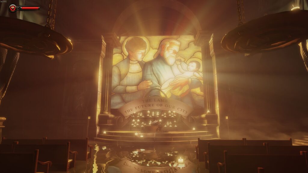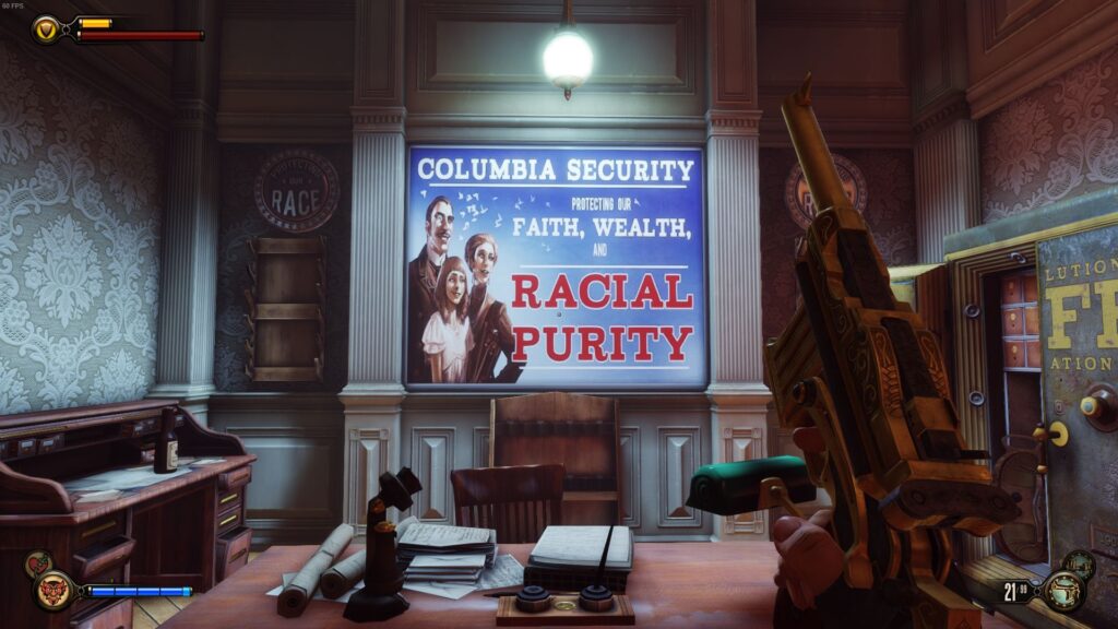 Infinite rozpoczyna się podobnie jak pierwszy Bioshock. Z tą różnicą, że gracz po wejściu do stojącej pośrodku oceanu latarni nie zanurza się w odmęty w batysferze, lecz za pomocą specjalnego, odrzutowego krzesła wyniesiony zostaje w górę. A tam, spośród opromienionych blaskiem Słońca obłoków, w akompaniamencie dziękczynnych chórów, wyłania się miejsce akcji – Columbia; miasto w chmurach, którego ekspozycja w początkowych minutach gry zachwyciła niejednego. Zbudowane na podwalinach wyidealizowanych patriotycznych cnót, będące hołdem dla hegemonizmu, unosi się w powietrzu – jak głosi tutejsza propaganda – dzięki woli i sile niezmąconej wiary zarządzającego nim, samozwańczego proroka Comstocka. Pozornie mogłoby uchodzić za raj… gdyby nie było jego antytezą. Służy ono bowiem twórcom gry do rozliczenia się z mitem o zbawiennej w dziejach świata roli USA – państwa, o którym równie zasadne jest powiedzieć, że zostało zbudowane na fundamentach wolności i demokracji, jak i na trupach rdzennych mieszkańców zajmujących niegdyś jego terytorium. Levine zaś, przypominając choćby masakrę pod Wounded Knee, serwuje graczowi przyspieszony kurs amerykańskiej historii, bogatej w wątki rasistowskie, apologizującej niewolnictwo czy wyzysk, pełnej konfliktów nie tylko wewnętrznych, ale i międzynarodowych. Ojcowie Założyciele – uprzywilejowana w Columbii kasta – to próbujący stworzyć doskonalsze (w ich mniemaniu) społeczeństwo fanatycy, promujący kult jednostki, przeświadczeni o wyższości i własnej nieomylności, z charakterystycznym poczuciem elitaryzmu. Świadomi w dodatku, jak ważną rolę w utrzymaniu ich wpływów pełni indoktrynacja dzieci. Stojący na ich czele Comstock rządzi miastem jako namaszczony przez anioły wybraniec, cynicznie wykorzystując religię dla uświęcenia swojej władzy. Choć nazywa siebie lustrem odbijającym twarz Boga, jest to w istocie odbicie wyjątkowo skrzywione. Nie ma w nim za grosz miłosierdzia: wychodzi z założenia, że skoro Stwórca wybacza – on już nie musi. Ten, kto mu się przeciwstawi, zostaje okrzyknięty bluźniercą i świętokradczym wywrotowcem. Występującym przeciwko ustalonemu porządkowi anarchistą. Fałszywym prorokiem.